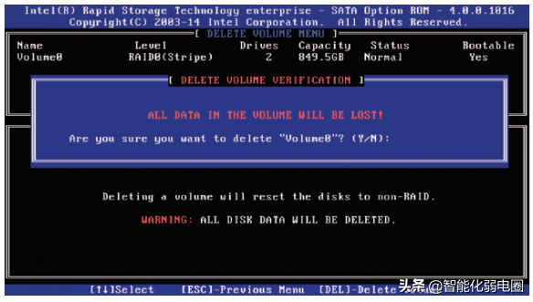 当您进入删除RAID 卷菜单时,会出现系统提示。