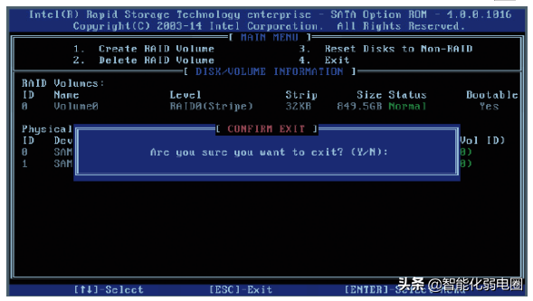 你确定你要退出吗? Y/N,Y将启动SATA RAID配置界面,N将取消退出操作。