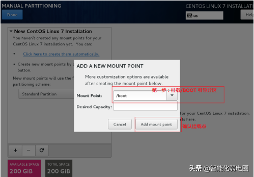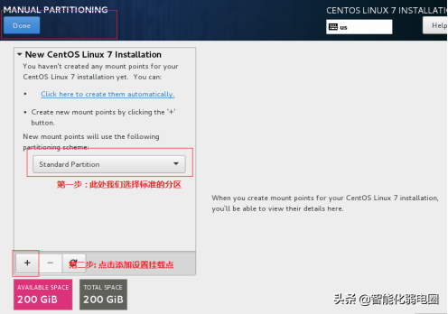 9. 将出现一个自定义分区框。这里选择一个标准分区,并在第二步中设置挂载点。