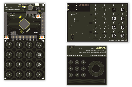 包括不同种类的触摸功能演示板(包括触摸按键、滑条、圆环、接近感应等),用户可以配合TPS32 SDK中TPSensor®的代码例程,结合TPSensor® Designer工具快速上手实现具体应用中所需触摸功能。