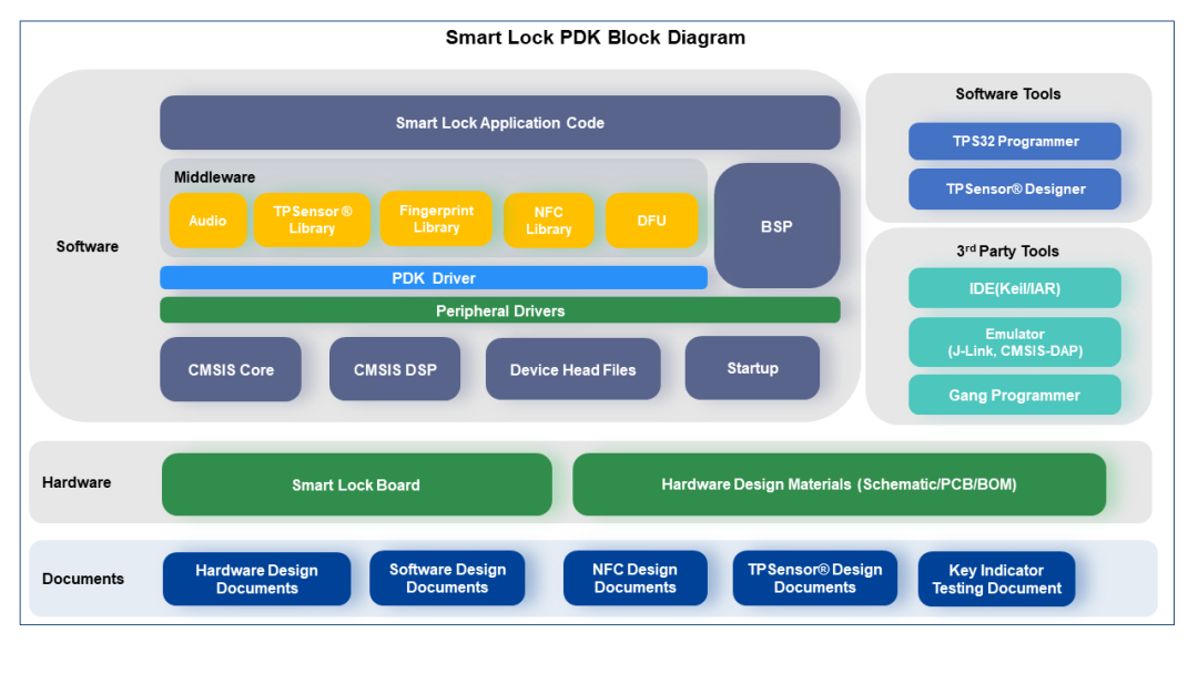 开发套件(PDK)基于TPS32 SDK的底层框架,加入了智能锁应用中主要功能的中间件支持(包括触摸库、指纹库、语音解码库、NFC读卡库、OTA升级等);另外还包含了智能锁方案的硬件/固件参考设计文档(如NFC、触摸)以及重要的测试结果文档。