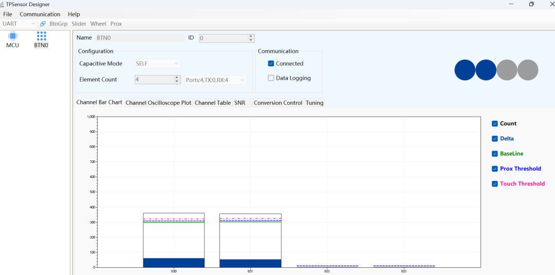 - 通过UART接口以图形化界面观察触摸数据用于调整触摸组件配置参数