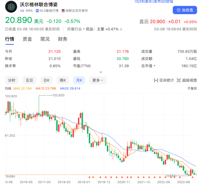 近日,美国制药巨头沃尔格林(Walgreens)发布了2024年第一季度财务报告。报告期末,总收入367.07亿美元,归属于母公司净利润-0.67亿美元。沃尔格林的股价在过去五年里下跌了68%,尤其是过去一年,由于该公司业绩近年来持续下滑,最近在道琼斯工业平均指数中触底。被逐出道琼斯工业平均指数。