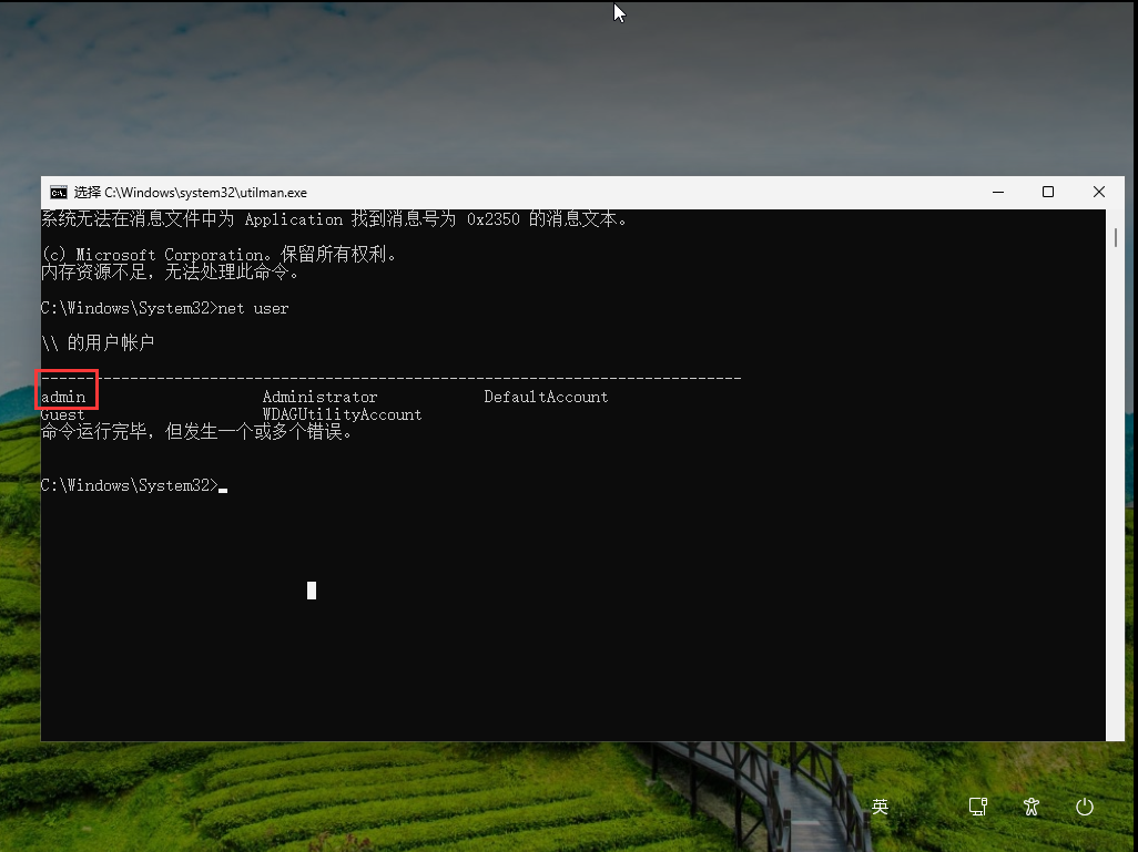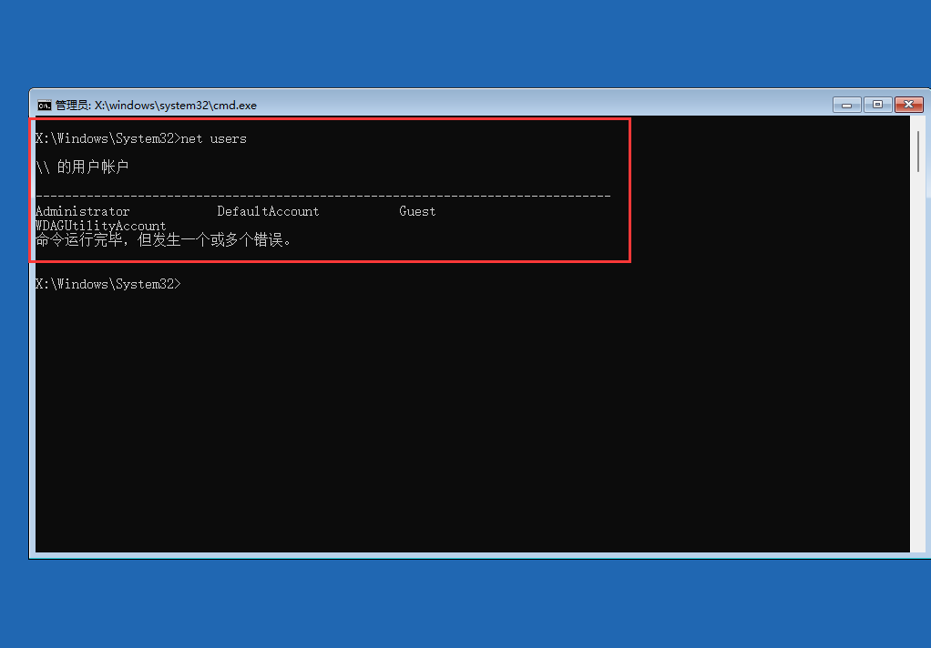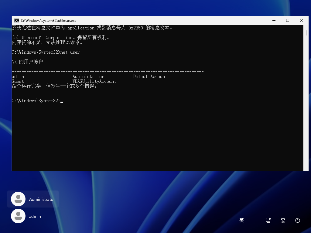 使用net user命令查看当前账号。可以发现,在修复界面下,看不到当前admin用户,只能看到系统默认的几个用户,如果直接想修改admin用户,在修复界面是没有办法直接修改的。