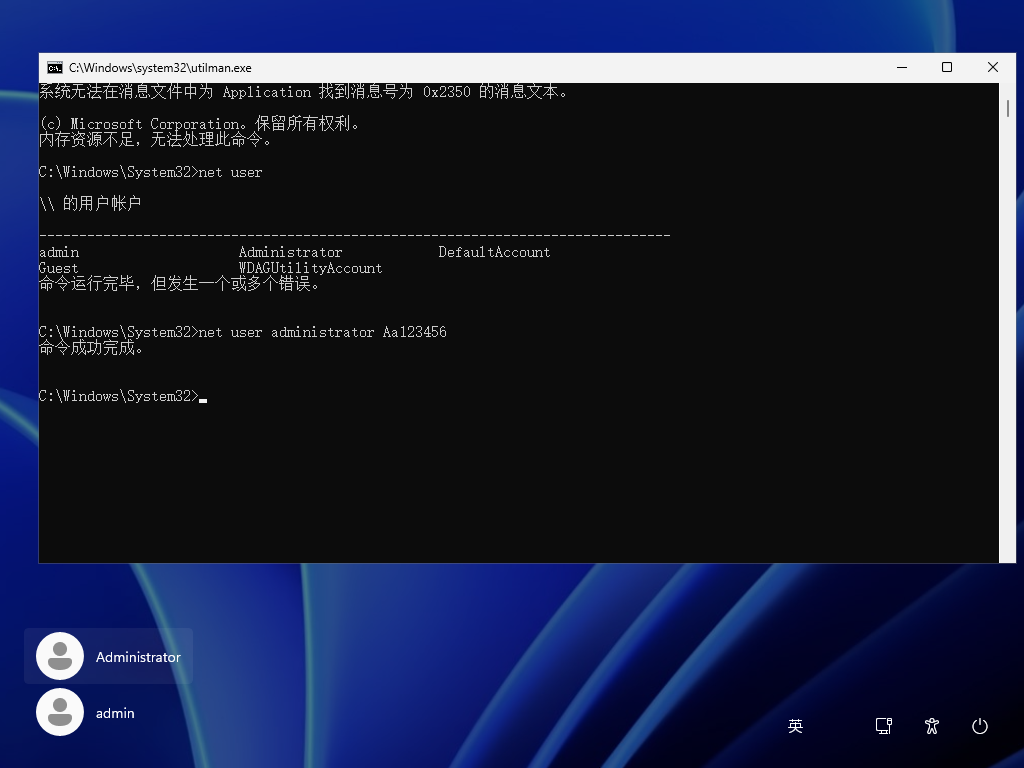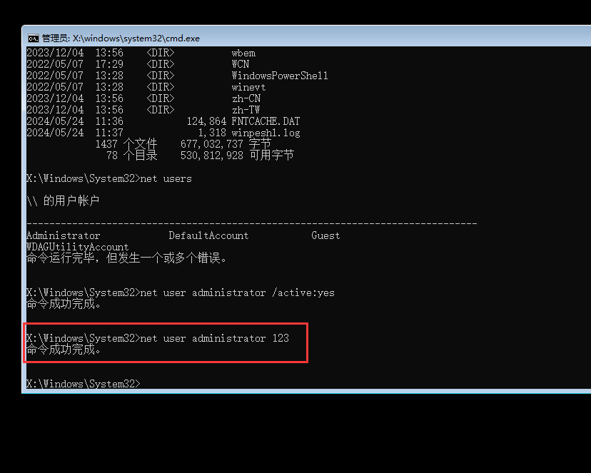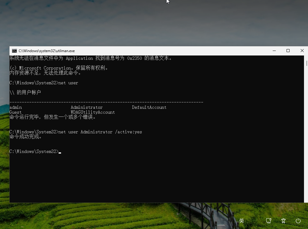 net user administrator /active:yes 执行这个命令后,administrator 账户将被激活。激活完成之后,更改密码。
