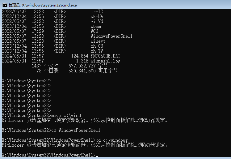 再次进入修复界面的命令提示符,这里要输入bitlocker密钥。但是也可以直接点击跳过。