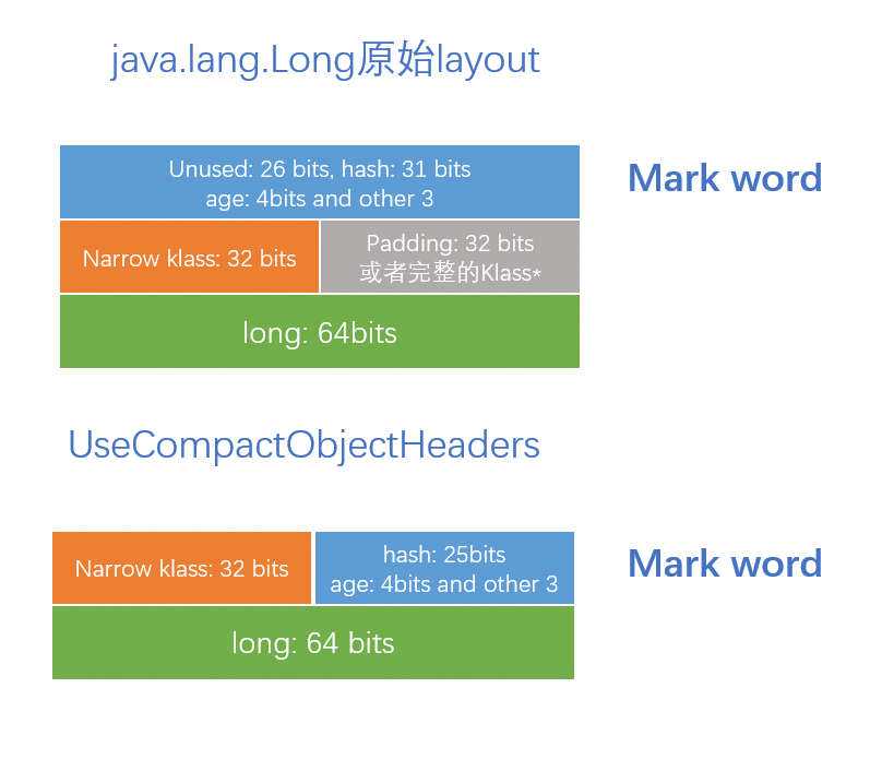 Compact object headers的核心逻辑是将单独的narrow klass指针(压缩class指针)encode在基础的对象头的第一个word:mark word中,释放原先单独占用一个word的narrow-klass/klass指针的空间,从而实现对Java对象头整体的压缩和内存占用优化。我们可以看到java.lang.Long对象应用对象头压缩后,内存占用从24 bytes减少到16 bytes,减少了1/3。由于原始layout的java对象头需要支持biased locking以及CMS GC,需要预留更多的unused bits,所以使用对象头压缩无法支持biased locking以及CMS。(注:biased locking在JDK17中默认关闭,JDK21+中删除,CMS GC在JDK17+中删除)