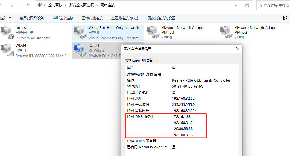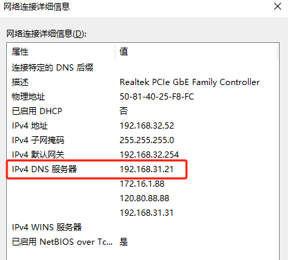 我们打开网络设置可以看到IP地址设置里的DNS地址是内网地址。难道是这个内网DNS服务器地址有问题?还是因为设置了太多的DNS地址(有内网有外网地址)?经过最终的排查,确认是内网DNS服务器地址问题。