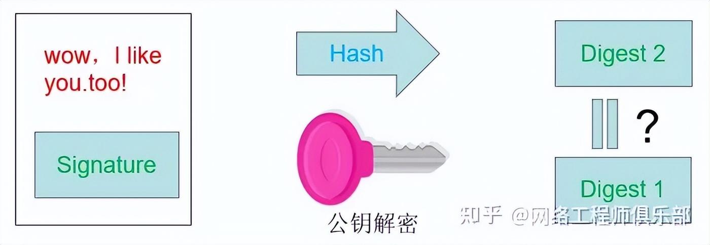 8、苏珊收到信后,去掉“数字签名”(signature),用红红的公钥解密,得到这封信的哈希值1(摘要1)。这就证明这封信确实是红红寄来的。