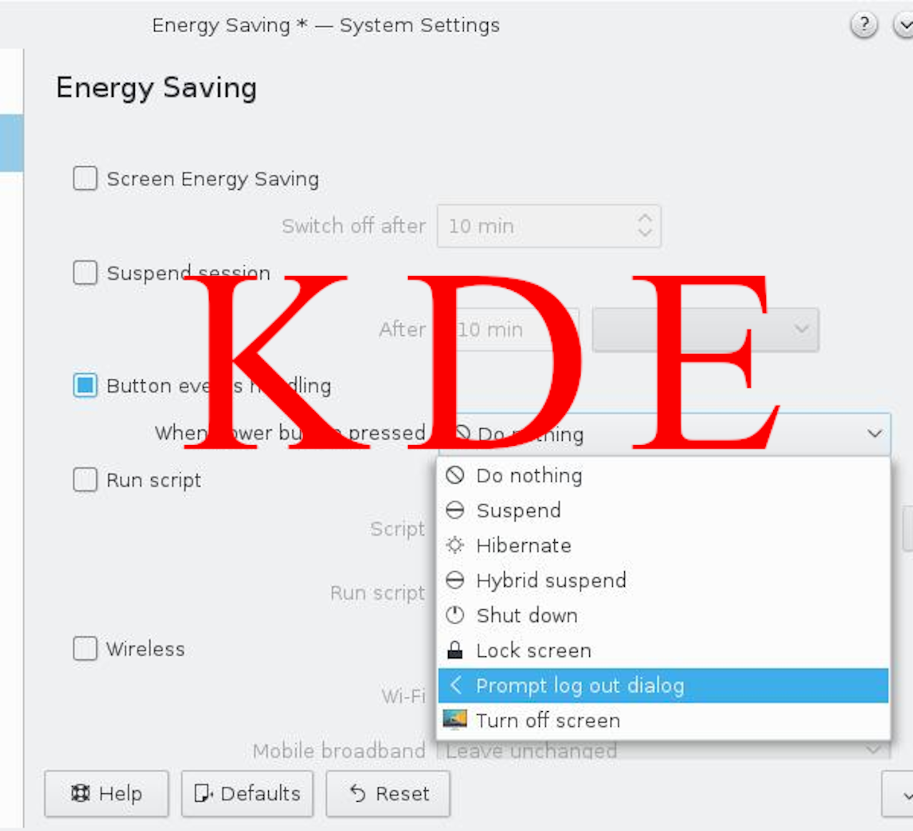 对于任何桌面来说,此过程都是相似的。例如,KDE 在系统设置的电源管理面板中包含Buttong 事件处理选项。