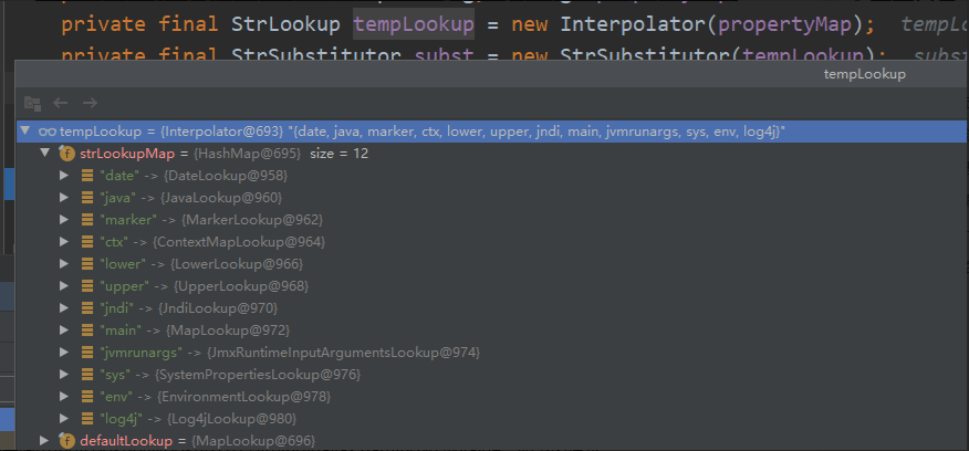 那么总共有多少Strlookup的子类对象可供选择呢,可供调用的Strlookup都存放在当前Interpolator类的strLookupMap属性中,如下所示