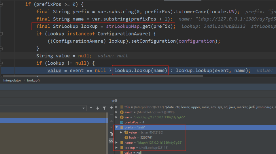 经过一段的嵌套调用,来到Interpolator.lookup,这里会通过var.indexOf(PREFIX_SEPARATOR)判断”:”的位置,其后截取之前的字符。截取到jndi然后就会获取针对jndi的Strlookup对象并调用Strlookup的lookup方法,如下图所示