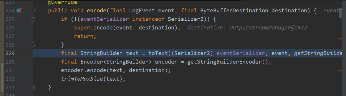 继续跟进在encode中会调用toText方法,根据注释该方法的作用为创建指定日志事件的文本表示形式,并将其写入指定的StringBuilder中。