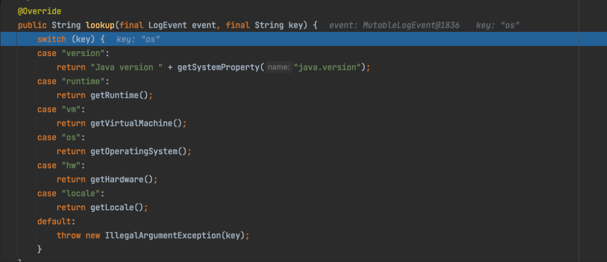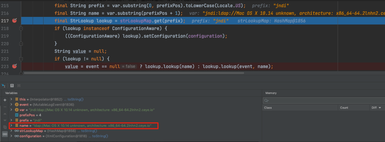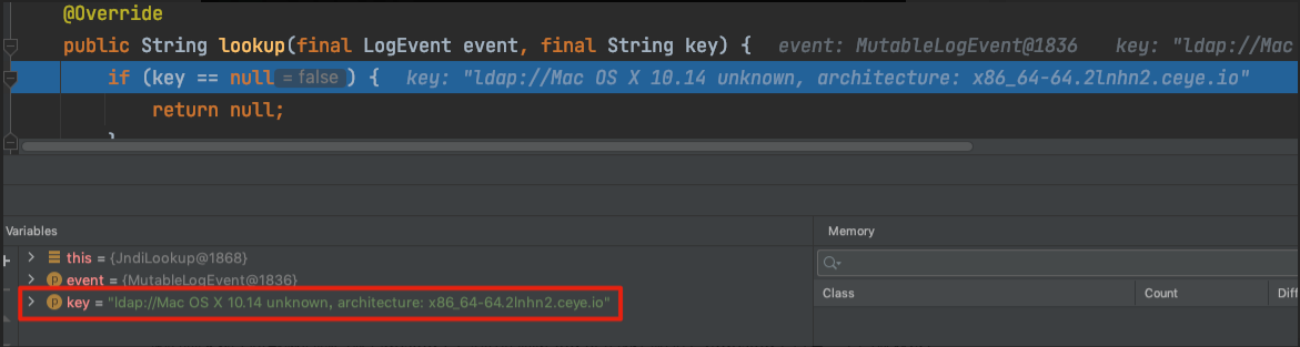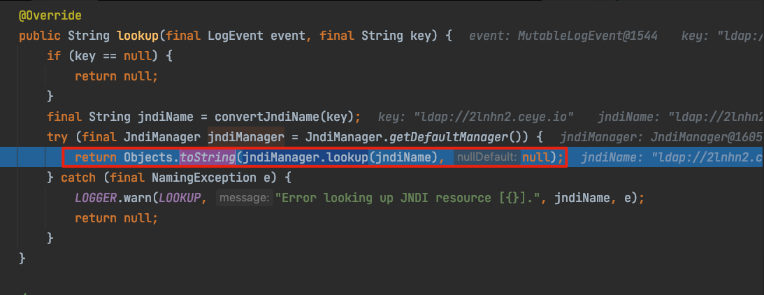 如果参数占位符${prefix:key}有前缀,Interpolator会从指定前缀对应的StrLookup实例中查询key。如果参数占位符${key} 没有前缀,则Interpolator 从默认查找器运行查询。例如,如果使用${jndi:key},则会调用JndiLookup 的查找方法并使用jndi(javax.naming) 检索该值。如下所示。