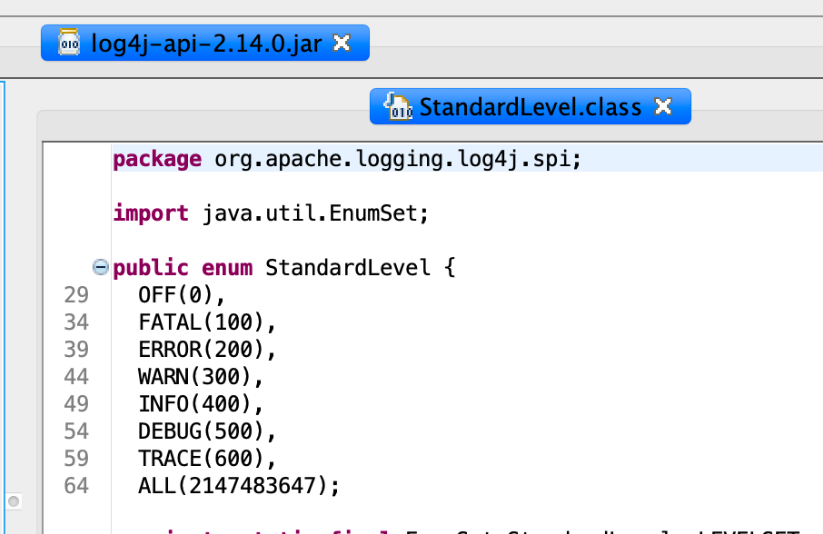 说到这里,我们已经详细了解了logger.error()造成RCE的原理,那么问题就来了,logger有很多方法,除了error以外还别方法可以触发漏洞么?这里就要提到Log4j2的日志优先级问题,每个优先级对应一个数值intLevel记录在StandardLevel这个枚举类型中,数值越小优先级越高。如下图所示: