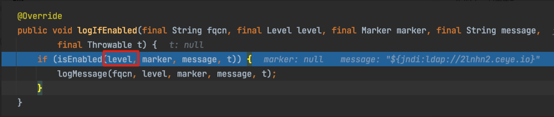 跟进isEnabled方法发现,只有当前日志优先级数值小于Log4j2的200的时候,程序才会继续往下走,如下所示