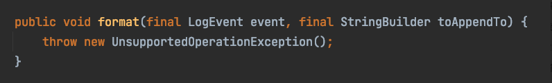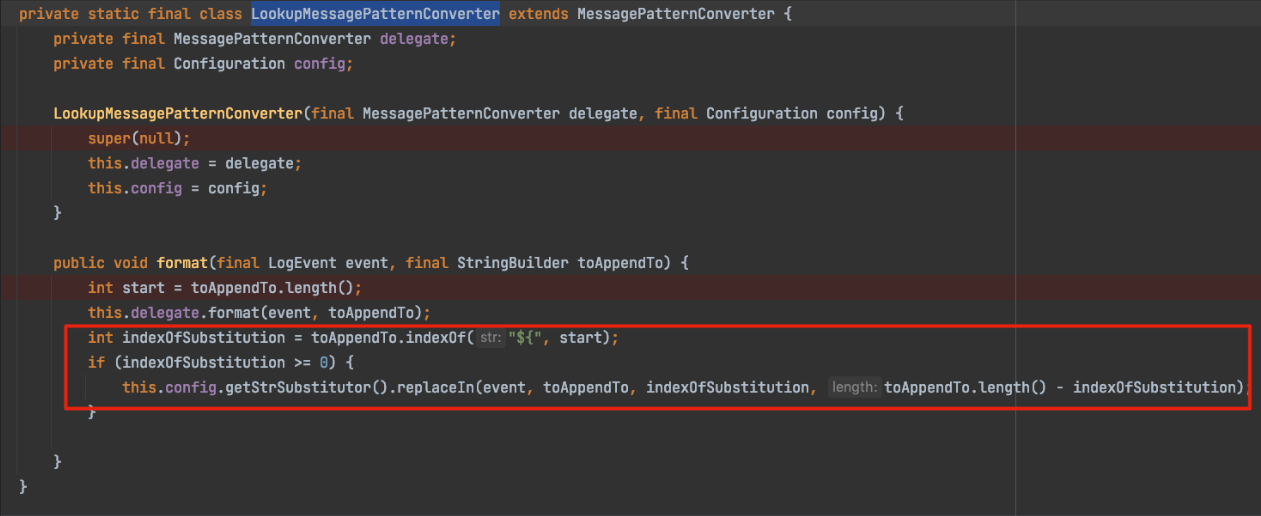 可以看到并没有对传入的数据的“KaTeX parse error: Expected ‘}’, got ‘EOF’ at end of input: …的点就没有了么?当然不是,对“{}”的处理,开发者将其转移到了LookupMessagePatternConverter.format()方法中,如下所示