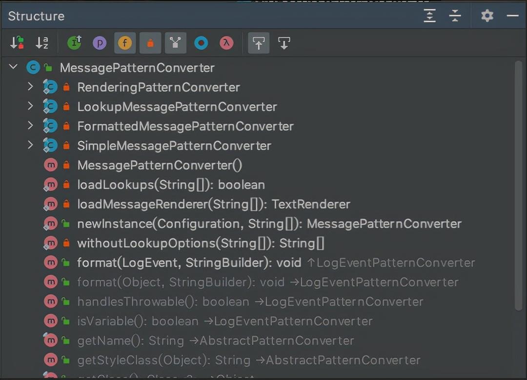 可以很清楚的看到 增加了三个静态内部类,每个内部类都继承自MessagePatternConverter,且都实现了自己的format方法。之前执行链上的MessagePatternConverter.format()方法则变成了下面这样