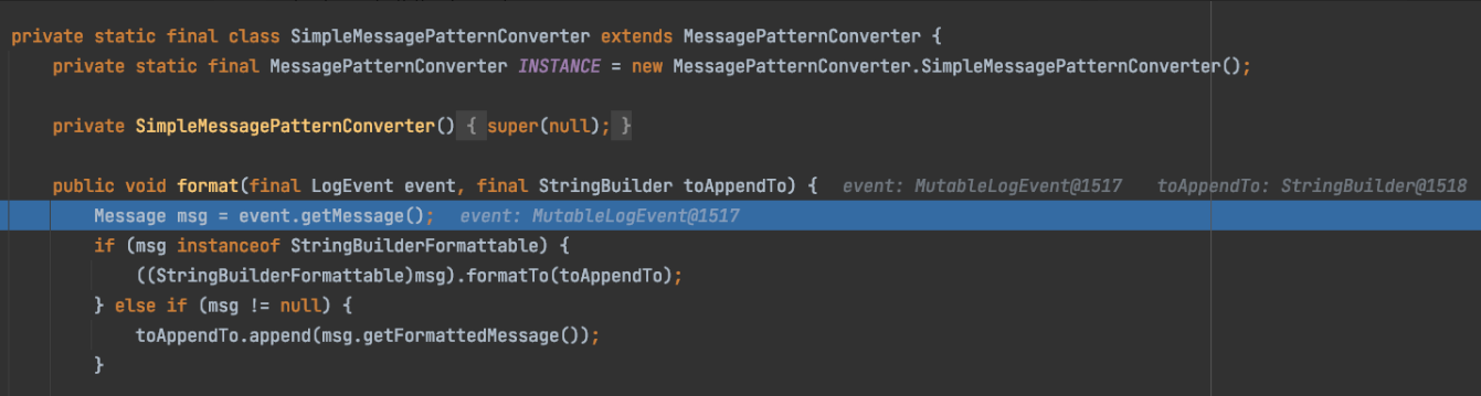 org.apache.logging.log4j.core.pattern.DatePatternConverterorg.apache.logging.log4j.core.pattern.LiteralPatternConverterorg.apache.logging.log4j.core.pattern.ThreadNamePatternConverterorg.apache.logging.log4j.core.pattern.LevelPatternConverterorg.apache.logging.log4j.core.pattern.LoggerPatternConverterorg.apache.logging.log4j.core.pattern.MessagePatternConverterorg.apache.logging.log4j.core.pattern.LineSeparatorPatternConverterorg.apache.logging.log4j.core.pattern.ExtendedThrowablePatternConverter这么多Converter都将一个个通过上图中的for循环对日志事件进行处理,当调用到MessagePatternConverter时,我们跟入MessagePatternConverter.format()方法中一探究竟