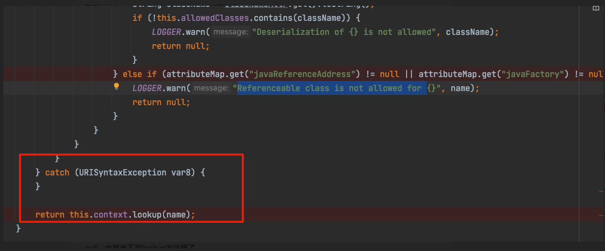 这里要求javaFactory为空,否则就会返回”Referenceable class is not allowed for xxxxxx”的错误,想要绕过这一点其实也很简单,在JndiManager.lookup方法中有一个非常非常离谱的错误,就是在捕获异常后没有进行返回,甚至没有进行任何操作,我看不懂,但我大为震撼。这样导致了程序还会继续向下执行,从而走到最后的this.context.lookup()这一步 ,如下所示