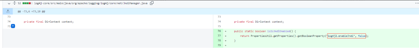在最新的修复https://github.com/apache/logging-log4j2/commit/44569090f1cf1e92c711fb96dfd18cd7dccc72ea中,在初始化插值器时新增了检查jndi协议是否启用的判断,并且默认禁用了jndi协议的使用。