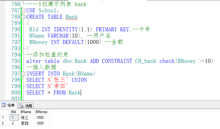 –1创建样本表bankUSE School;CREATE TABLE Bank(BId INT IDENTITY(1,1) PRIMARY KEY,–卡号BName VARCHAR(10), –用户名BMoney INT DEFAULT(1000) –金额)–添加对应为每个账户需要预留10元的支票约束alter table dbo.Bank ADD CONSTRAINT CH_bank check (BMoney=10)–插入数据INSERT INTO Bank(BName) SELECT N’张三’ UNIONSELECT N’李四’从银行