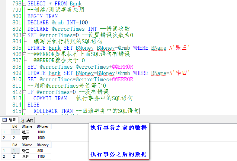 begin tran – 声明一个变量,用于确定下一条语句- 确定事务中的SQL 语句最终是执行还是回滚- 如果变量要执行,则确定SQL 语句的结果commit tran – else 如果Result 为true,则回滚tran – – 结果为false 回滚示例: 张三给李四汇款(默认每次1000元)