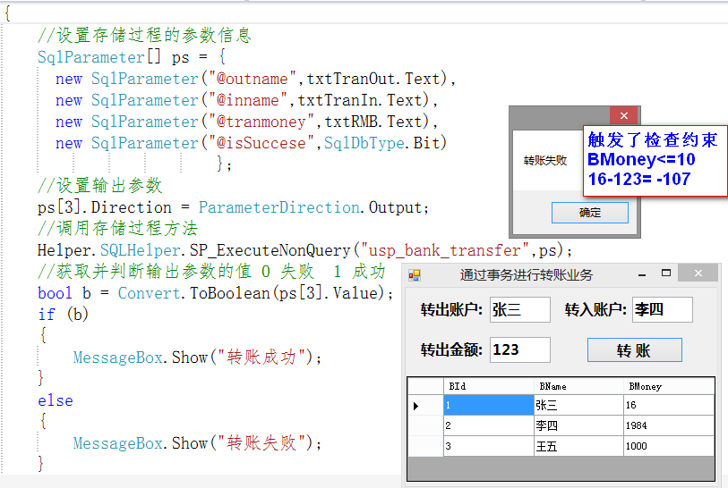 private void btnTran_Click(object sender, EventArgs e){ //自己写的,检测三个文本框的值是否满足特定需求//设置存储过程的参数信息SqlParameter[] ps={ new SqlParameter(‘ @outname’,txtTranOut.Text), new SqlParameter(‘@inname’,txtTranIn.Text), new SqlParameter(‘@tranmoney’,txtRMB.Text), new SqlParameter(‘@isSuccese’,SqlDbType.Bit) }; /设置输出参数ps[ 3].Direction=ParameterDirection.Output; //调用存储过程方法Helper.SQLHelper.SP_ExecuteNonQuery(‘usp_bank_transfer’,ps); //输出参数的值获取并判断0 失败1 成功bool b=Convert.ToBoolean(ps[ 3].Value); if (b) { MessageBox.Show(‘传输成功’) } else { MessageBox.Show(‘传输失败’);无论是否成功,都重新查询绑定数据转账是否成功并显示每个账户当前金额LoadData();}