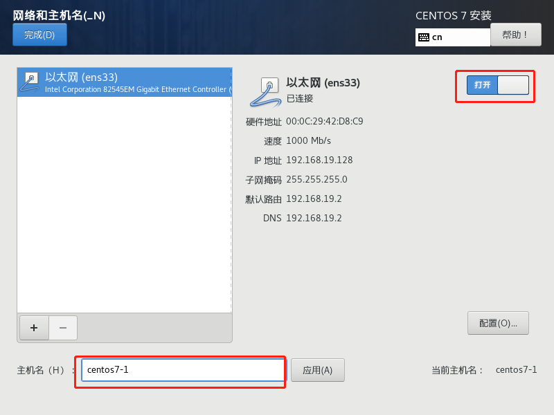 将开关设置为打开,将主机名更改为“centos7-1”并记住IP 地址。