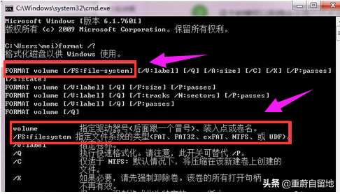 3. 输入命令format/? 搜索格式相关参数。所需的命令是格式化卷[/FS:文件系统]。其中,volume 是驱动器号,fs 是文件系统类型。