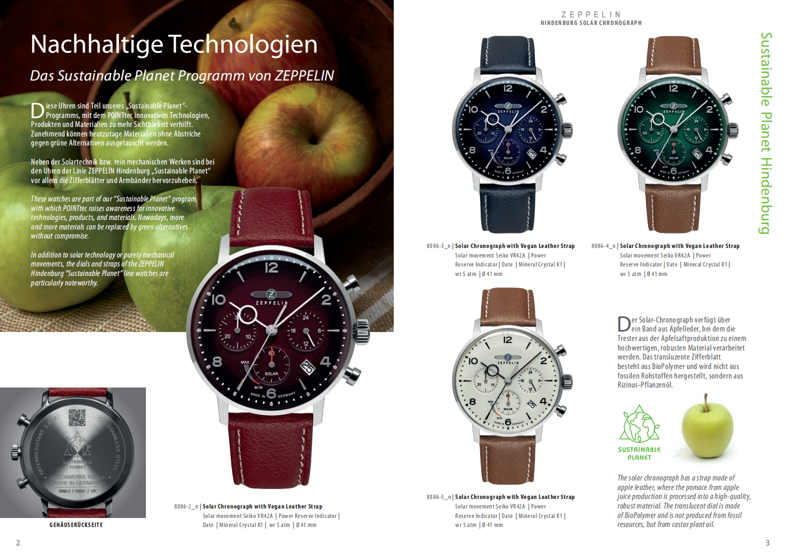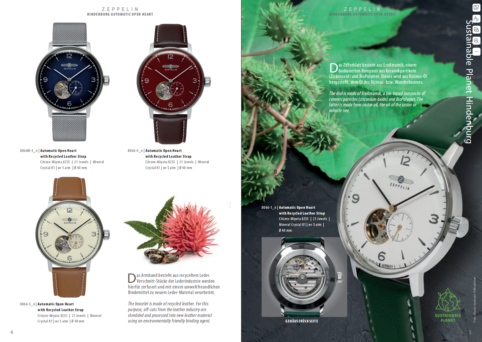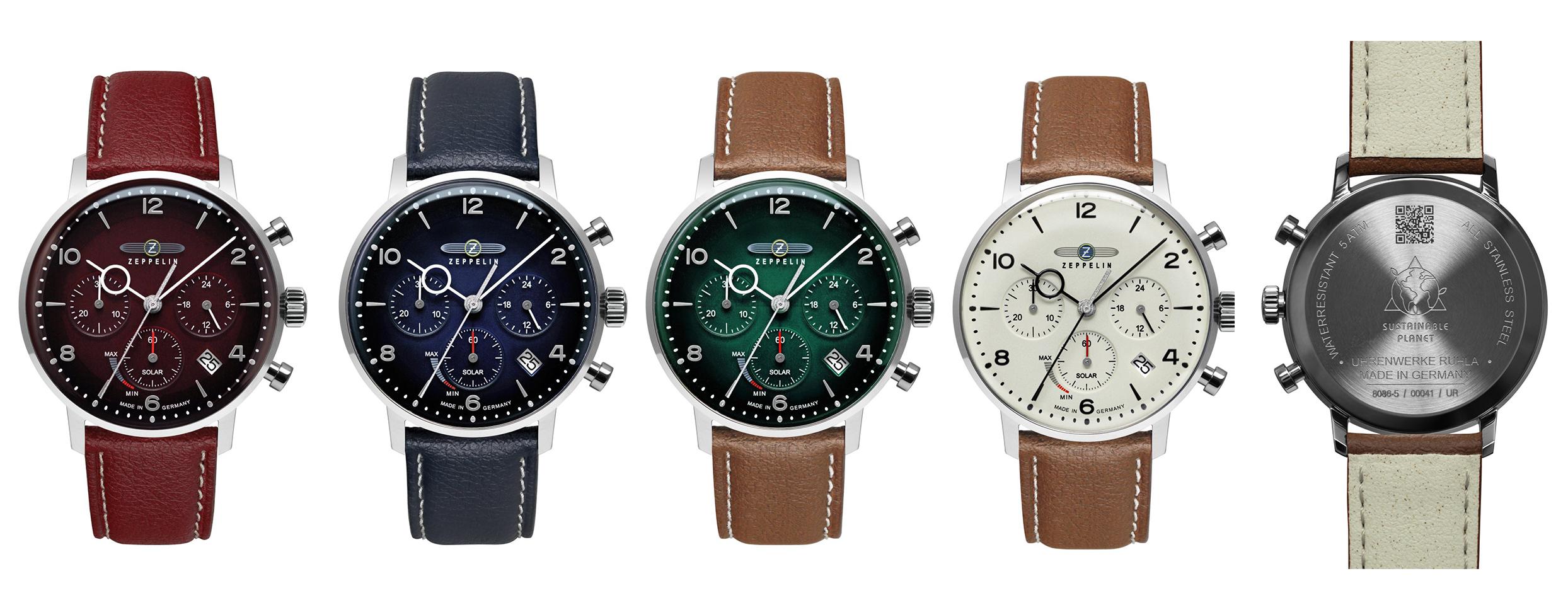 这些手表是“可持续地球”计划的一部分,POINTtec 在该计划中进行创新并提高人们对技术、产品和材料的认识。如今,材料的使用越来越不妥协,并被环保替代品所取代。除了太阳能技术和纯机械装置外,ZEPPELIN Hindenburg“可持续星球”系列腕表的表盘和表带尤为引人注目。