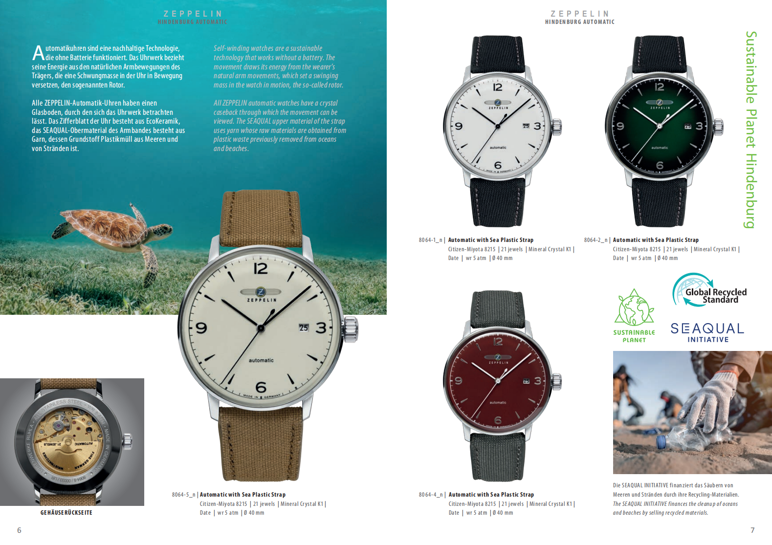 自动手表是一项可持续技术,使手表无需电池即可运行。该机芯从佩戴者的自然手臂运动中汲取能量,并驱动手表的摆动或质量,即所谓的转子。这款ZEPPELIN 自动腕表型号配有玻璃背板,可让您看到机芯。腕表表盘采用生态陶瓷制成,表带SEAQUAL上部的原材料是来自海洋和海滩的塑料废料制成的线。