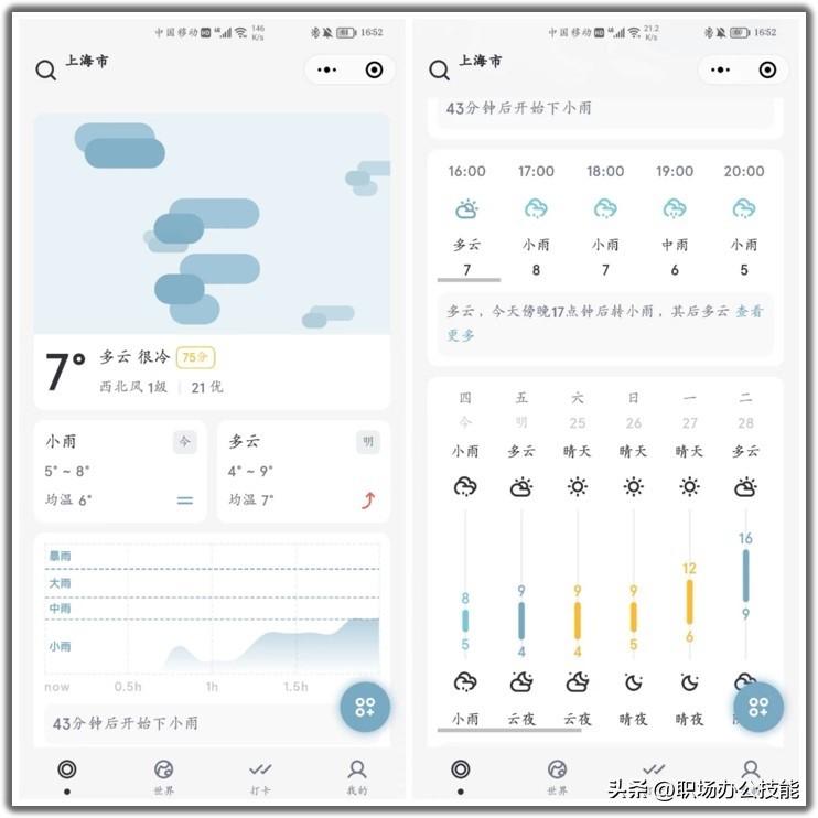 虽然手机自带的天气预报只告诉你今天的气温,但这个小程序却提供了实时天气信息以及详细的空气湿度和衣物指数,甚至告诉你什么时候会下雨。出门再也不怕雷雨天气了。