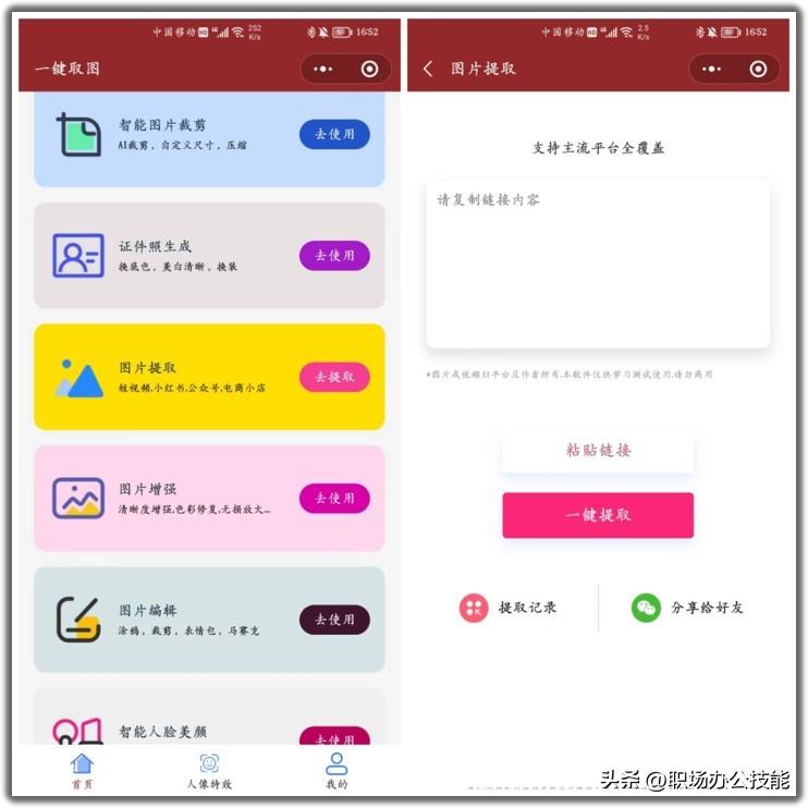 它是一款处理工具,可以让你对照片进行裁剪、剪裁、拼贴、添加水印等编辑任务。最大的特点是可以一键从短视频和公众号中提取无水印的图片。