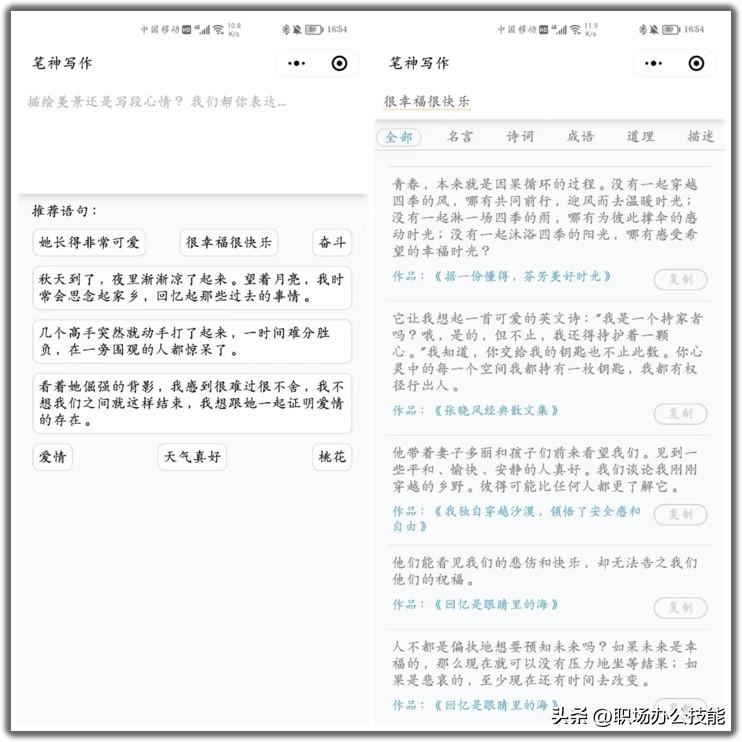 每次想发朋友圈,都想不出好的文案。这个小程序可以让您通过输入关键字来润色您的文本并生成相关的名言、诗歌、成语、原理等。直接复制并使用描述。