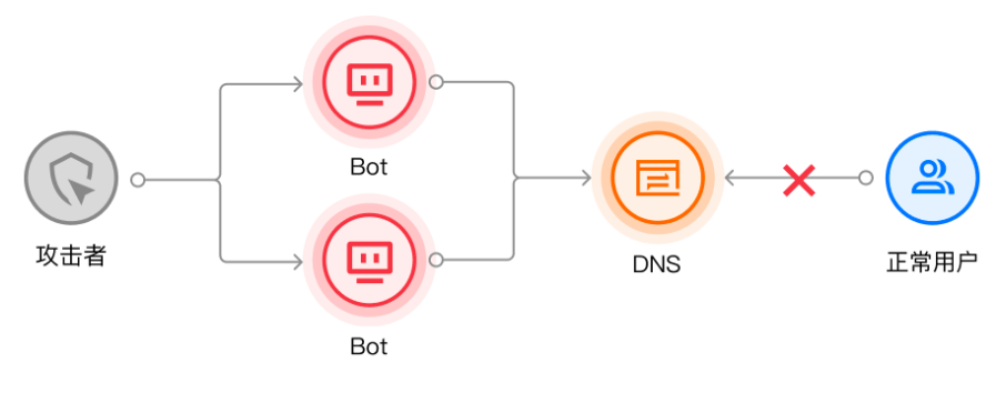 黑客控制“肉鸡”对DNS服务器发起大量的解析请求,将DNS服务器的资源耗尽,用户输入域名时就无法解析出IP地址,最终导致应用程序/网站无法访问。