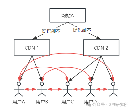(如下图,除了从CDN节点获取数据外,还能从其他用户侧获取数据,也能作为节点给其他用户提供数据)