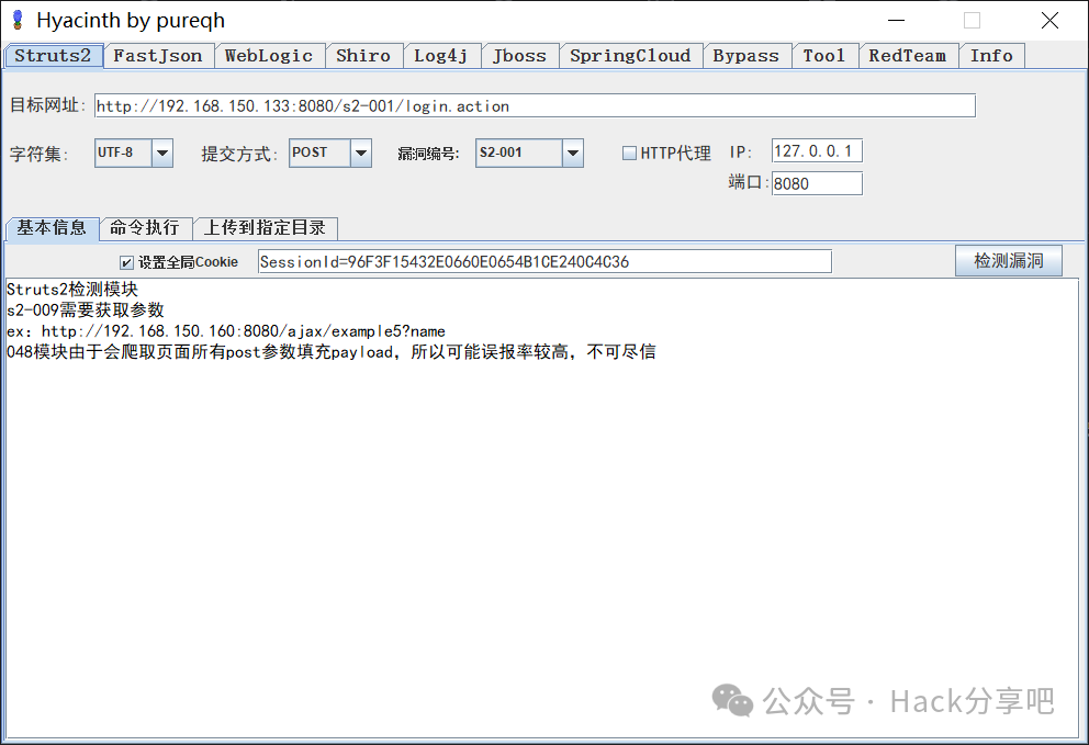 之前攻防的时候,总是需要打开多个jar包,觉得很麻烦,就做了一款java漏洞集合工具,包含Struts2、Fastjson、Weblogic(xml)、Shiro、Log4j、Jboss、SpringCloud、等漏洞检测利用模块,及免杀webshell生成模块 Bypass、以及一些小工具模块等,由于图形化比较简明易懂,所以也不需要使用说明吧 。