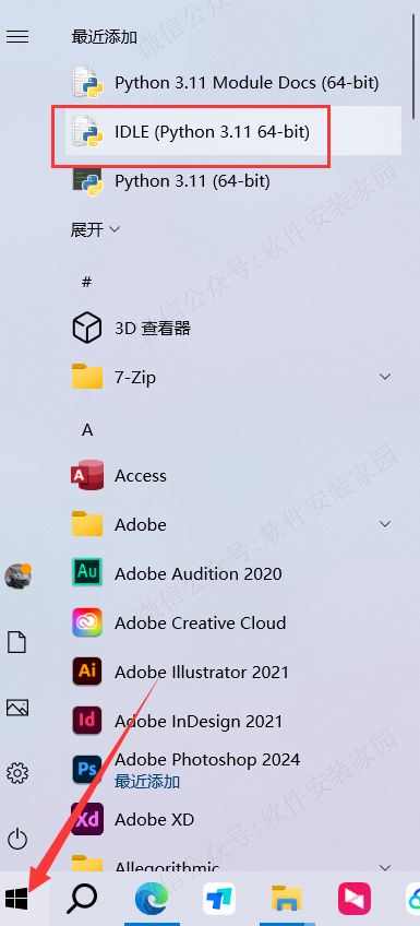 11、在开始菜单栏找到IDLE (Python 3.11 64-bit)双击运行打开软件