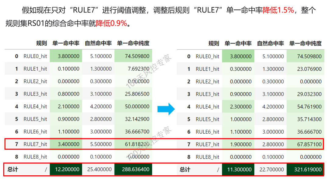 如果通过提升没有达到我们的预期,那我们可以再返回第1和2步骤进行调整,比如阈值进一步放松,或者增加更多规则进行阈值的放松等等,可以有各种组合的调整方式。当然也可以先列举出所有备选方案,同时执行调整策略,最后对比各方案调整后的规则集效果,从中选择最优。