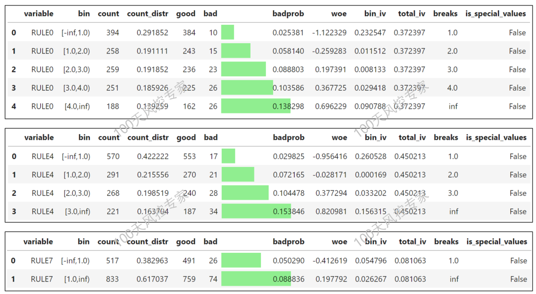 然后对有充分贷后表现的样本进行抽取,统计以上筛选规则命中情况,分析规则的变量分箱下区间坏账率的单调性。根据步骤二的筛选规则进行规则的进一步筛选。