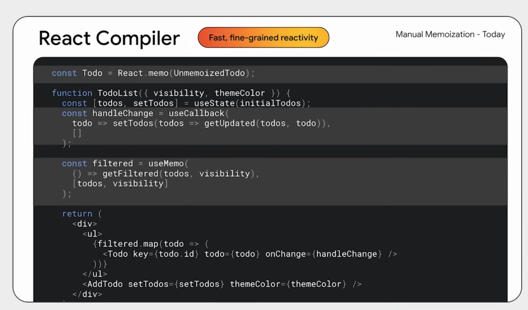 React Compiler:React Compiler是一个可以自动进行组件memoize的编译器。可以通过减少不必要的重新渲染来提高性能。React团队表示开发人员可以在不进行任何代码更改的情况下采用React Compiler。