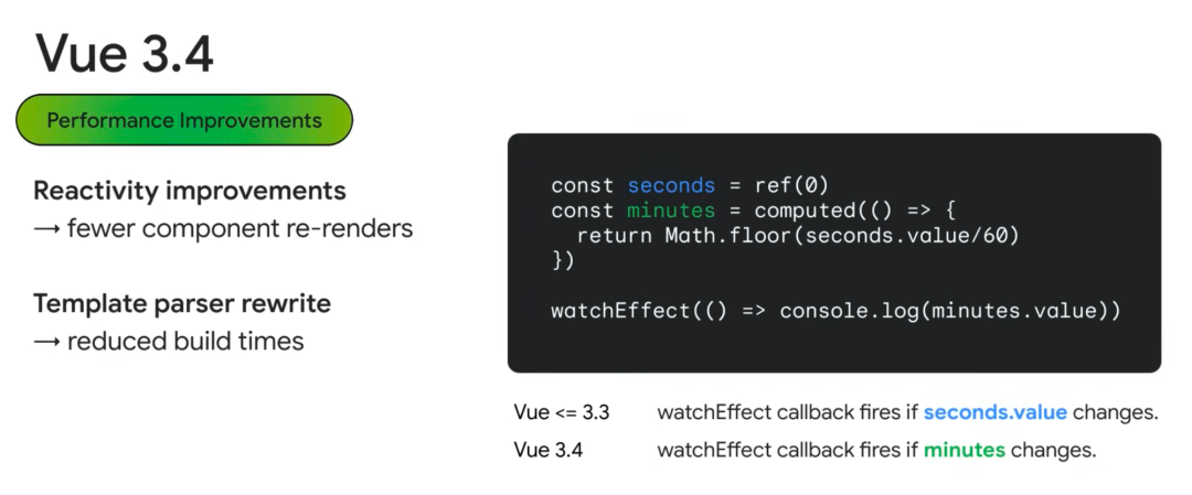 Vue 3.4 还包含了对 Vue 模板解析器的完全重写。由于这次更改,解析器现在可以大约在一半的时间内解析单文件组件(single file components)。作为最终用户,这些变化意味着你会看到稍微更快的构建时间,以及对于像 Vue TypeScript 和其他依赖于 Vue 解析器的插件执行时间的改进。