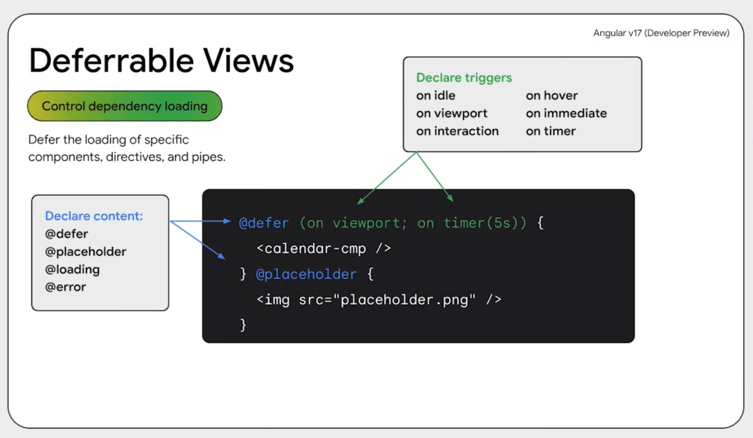 可延迟视图( Deferrable views):可延迟视图使得可以推迟加载特定的组件、指令和管道。例如,您可以推迟加载一个依赖项,直到内容进入视口或直到主线程处于空闲状态。