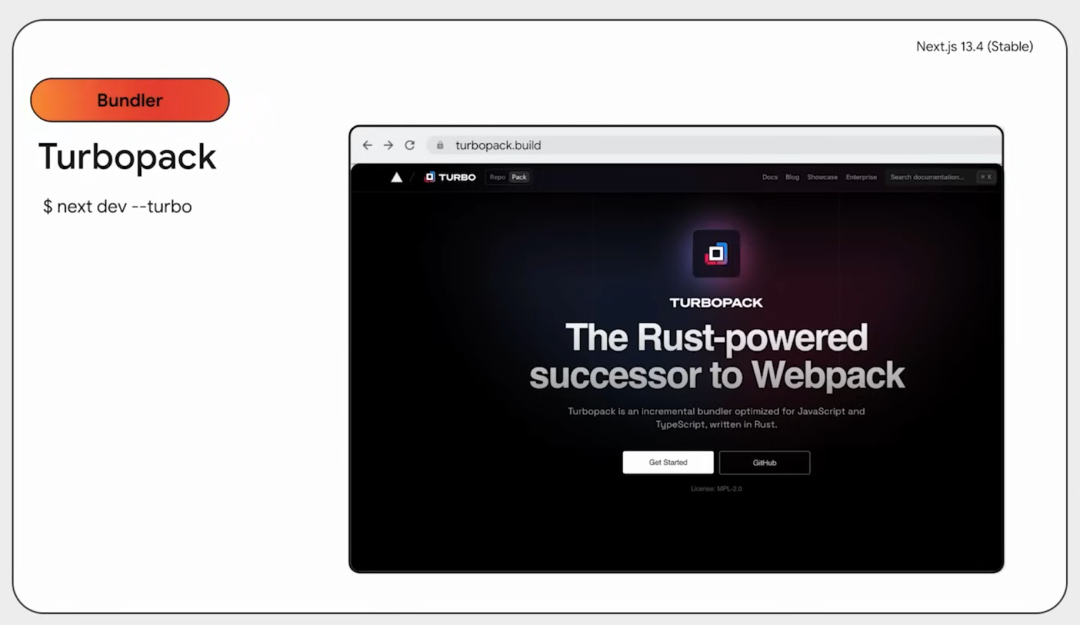 Next.js 目前的应用通常使用 Webpack 作为构建工具。然而,Vercel 一直在开发 Webpack 的继任者 —— Turbopack 。一旦准备就绪,TurboPack 将提供明显更快的开发构建,并且也将支持热模块替换。