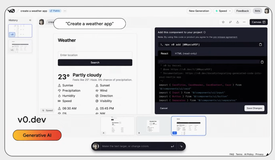 另外,我还想提一提 Vercel 的 v0 工具,它使用 AI 来生成使用 React、Tailwind CSS 构建的用户界面。你可以通过描述所需创建的内容,例如表单、列表,或上传所需结果的图像来提示 v0。这不仅是个很酷的想法,我认为这可能是我们首次见到 AI 被纳入框架工具中的例子。随着 AI 成为一个热门话题,看到 v0 和类似工具如何在未来几年发展将会非常有趣。