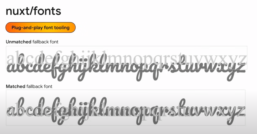 Nuxt 核心团队还在开发新模块以进一步增强框架能力。其中一个是 Nuxt Fonts ,它旨在简化在应用中使用和配置字体的工作,处理许多关于字体的最佳实践,例如添加资源提示、生成备用字体以及缓存第三方字体提供商的字体。