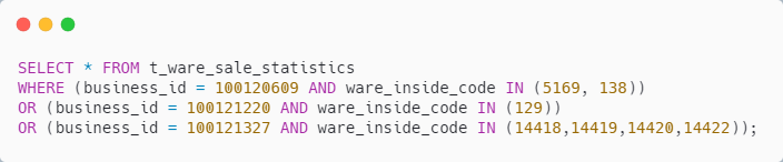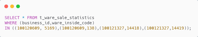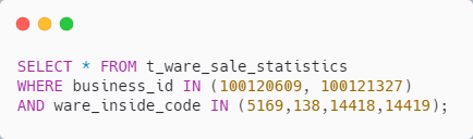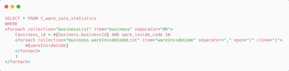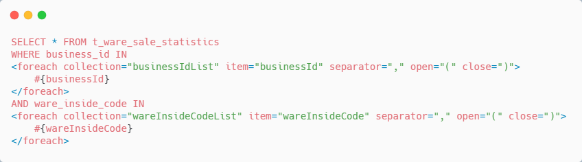 同样是利用 Mybatis 的 动态 SQL ,将 business_id 列表拼在一起、 ware_inside_code 拼在一起,类似如下